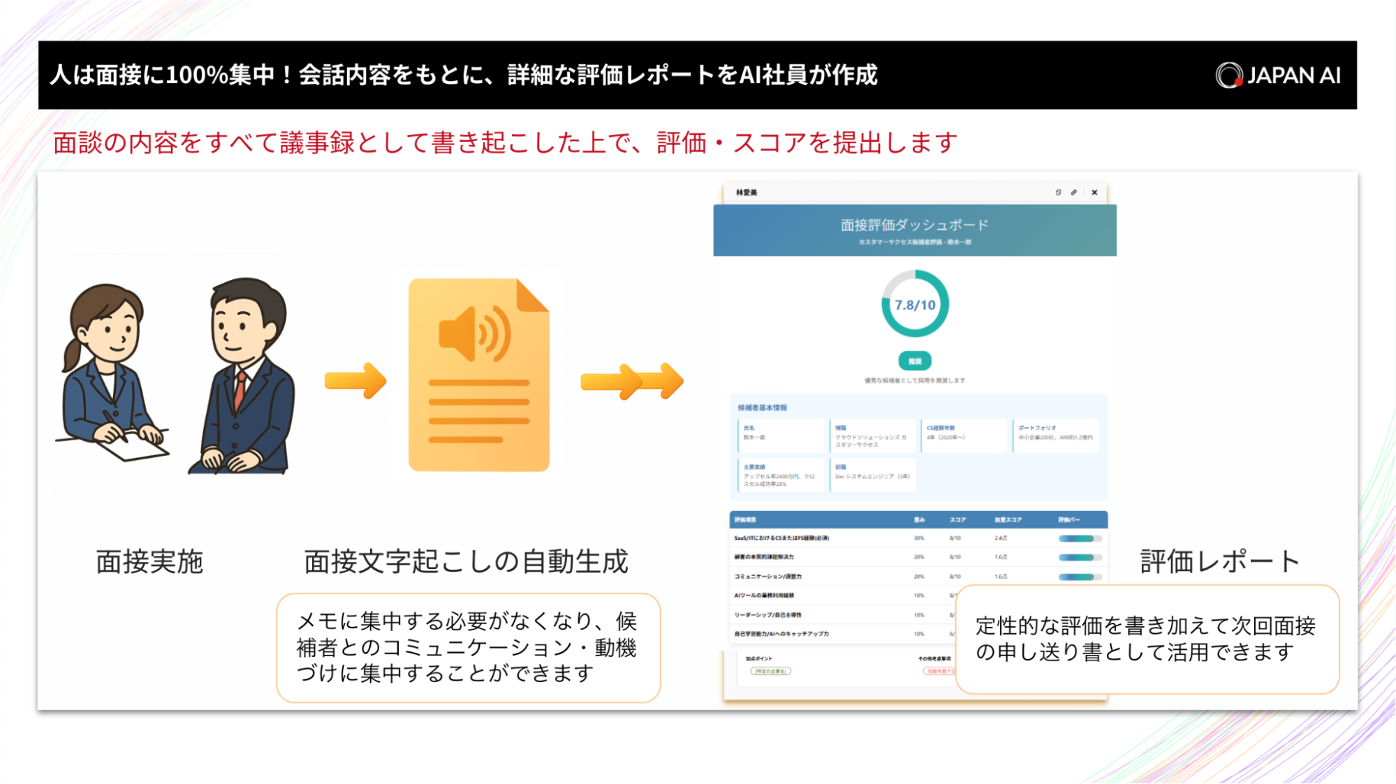 このような課題に対応するため、当社は採用評価業務を支援する「JAPAN AI HR」を開発しました。本サービスは、採用を完全自動化するのではなく、「評価」はAIが、「判断」は人が行うという考えのもと、人事部門と現場が一体となった採用活動品質向上の実現を目指します。