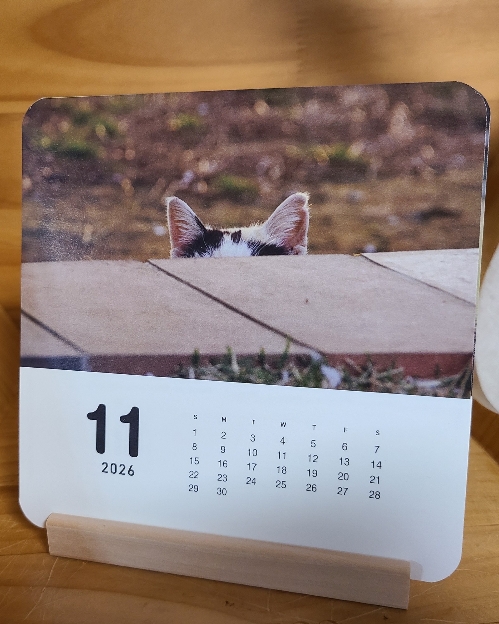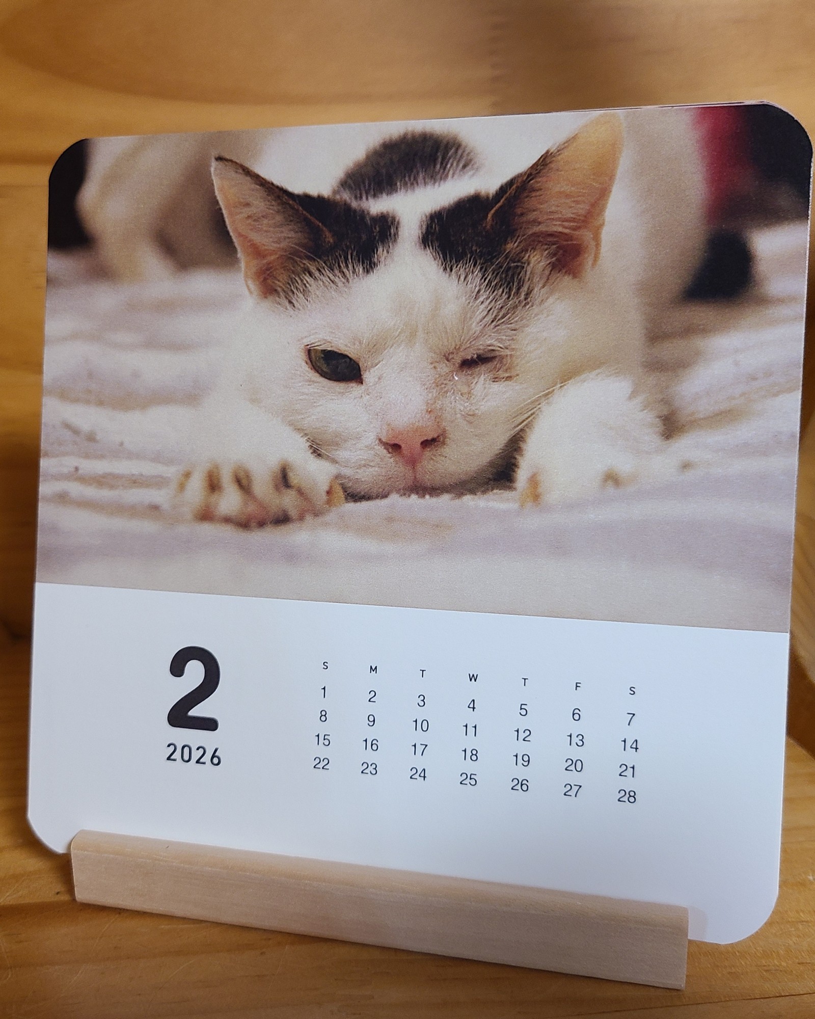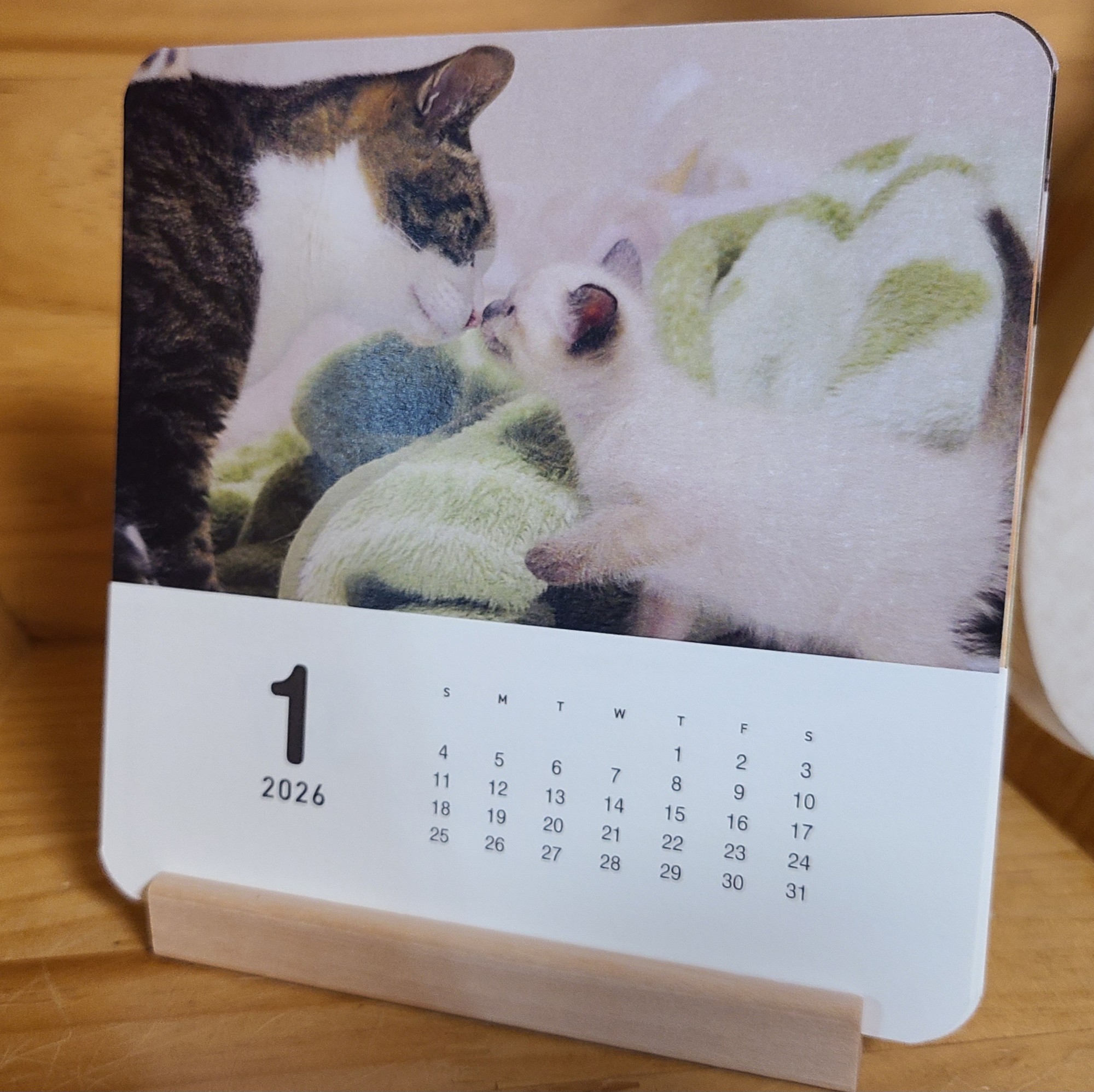 2026年1月〜12月の卓上カレンダー(148mmx148mm)を専用スタンドとともに郵送にてお送りします。カレンダーはご支援いただく画面で「こねこカレンダー」「ほごねこ(成猫)カレンダー」「さくらねこ&のらねこカレンダー」からお選びいただけます。