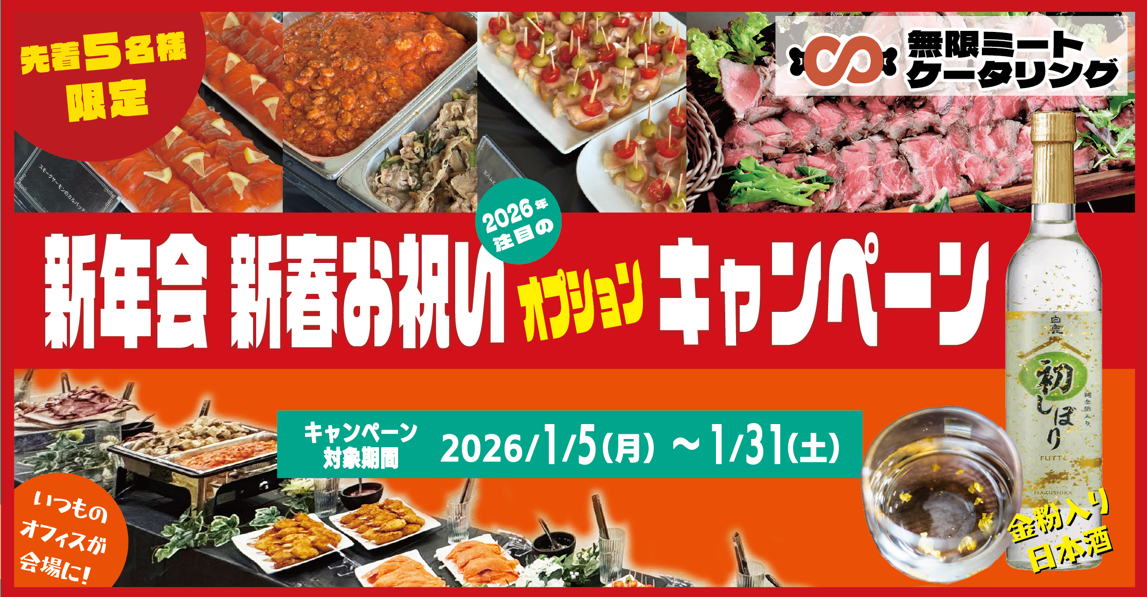 大阪市を中心に、ローストビーフ食べ放題・飲み放題の出張ケータリングサービスを提供する「無限ミートケータリング」(運営:いつもファンキーな有限会社、本社:大阪市淀川区)は、企業・団体の2026年新年会向けに、「純金箔入り日本酒」を人数に応じて提供する限定オプションプランを、2025年11月26日より受付開始いたします。 画像1: https://www.atpress.ne.jp/releases/559347/LL_img_559347_1.jpg 新年会 新春お祝いオプションキャンペーン