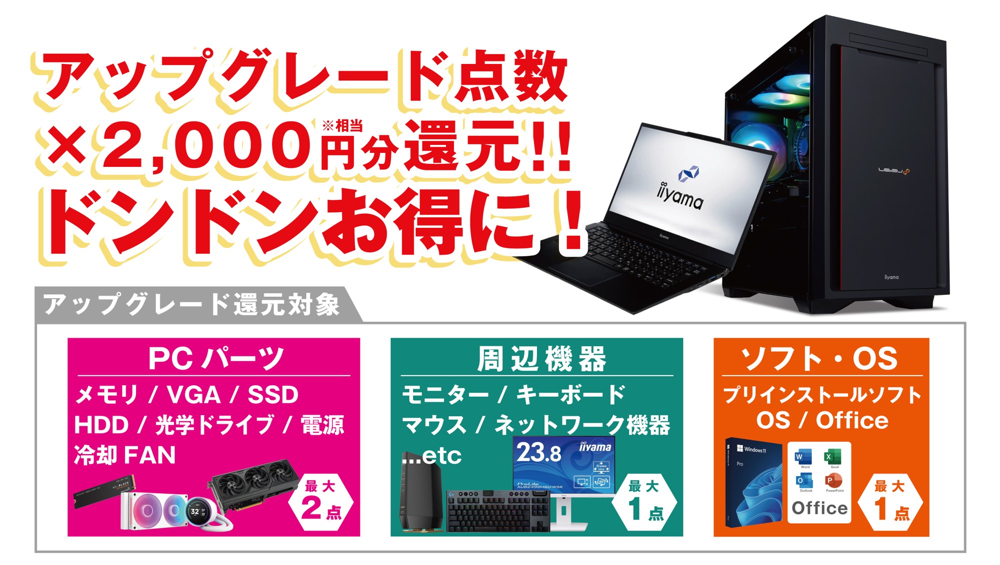 ご購入の対象PCは新品のiiyama PC (LEVEL∞、LEVELθ、STYLE∞、SENSE∞、SOLUTION∞)に限ります。対象PCご購入と同時に、下記のアップグレード、ならびに当社指定 周辺機器のご購入をいただくことで還元対象となります。