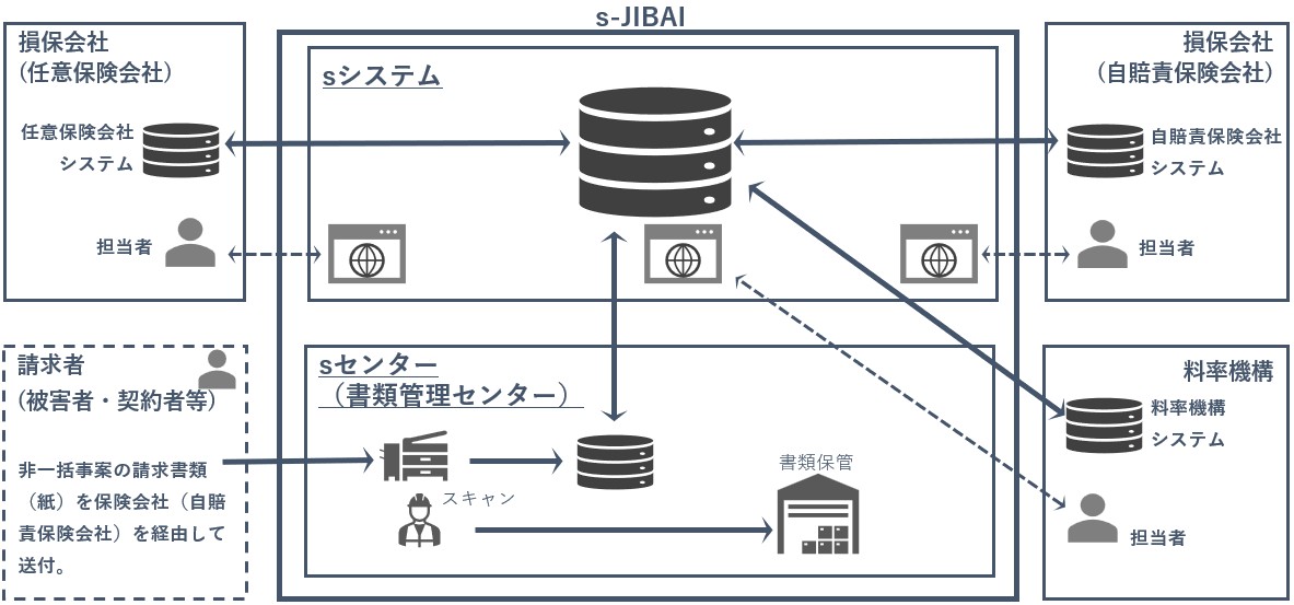 これまでの自賠責の損害調査業務では、保険会社および損害保険料率算出機構(以下「料率機構」)の間で必要な請求関係書類を紙原本で郵送していましたが「s-JIBAI」の利用開始により、郵送に代わりデータ連携・閲覧することが可能となります。
