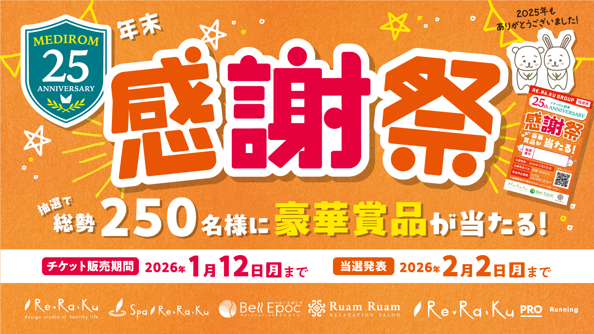 画像 : https://newscast.jp/attachments/6Mk1IivkfyQrcq2vEXNP.png株式会社メディロム・ウェルネス(本社:東京都港区、代表取締役:江口 康二)は、日頃より Re.Ra.Ku グループをご愛顧いただいている皆さまへの感謝の気持ちを込めて、2025年12月1日(月)より、総勢250名様に豪華賞品が当たる「2025年 年末感謝祭」を開催いたします。