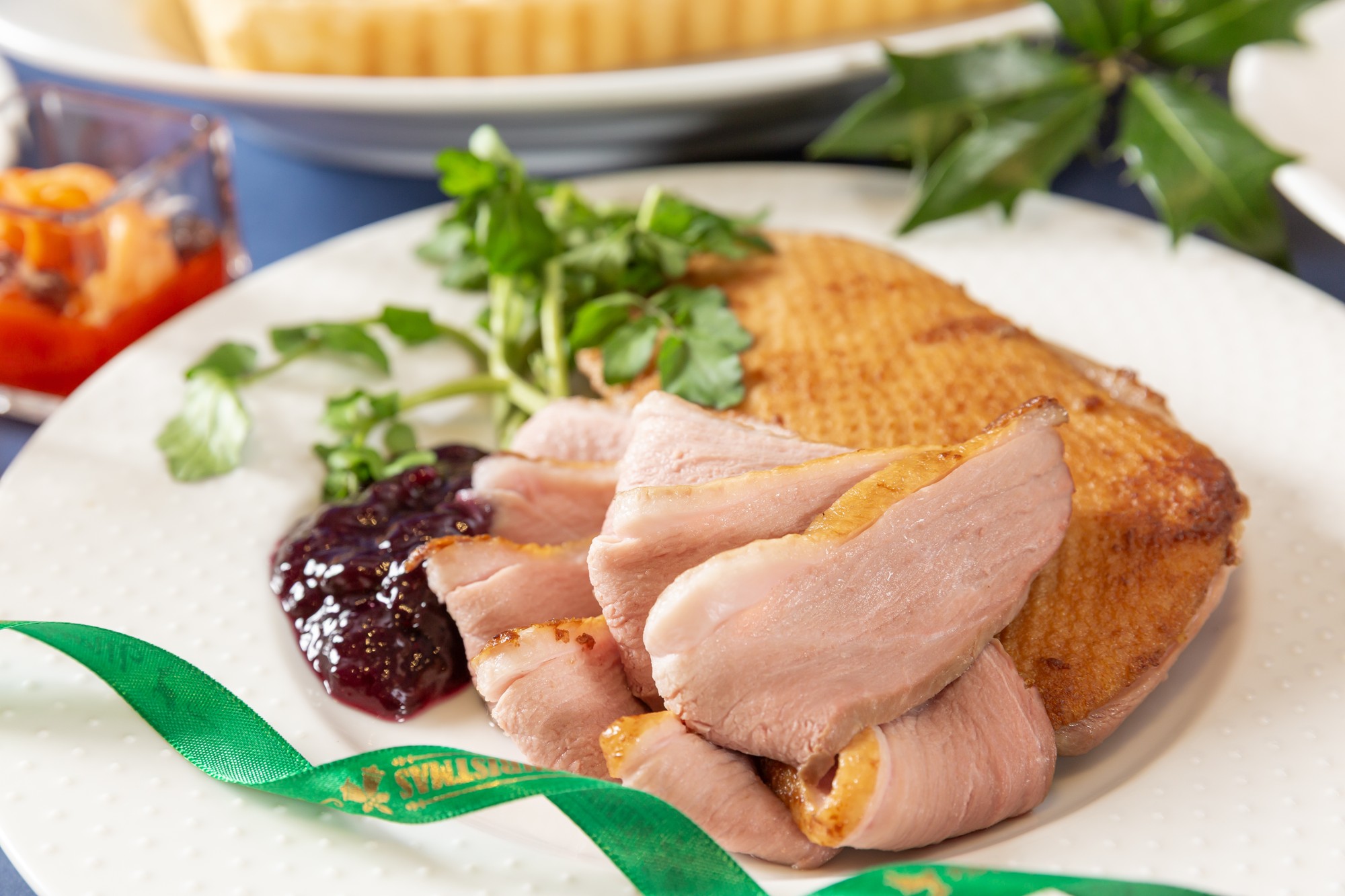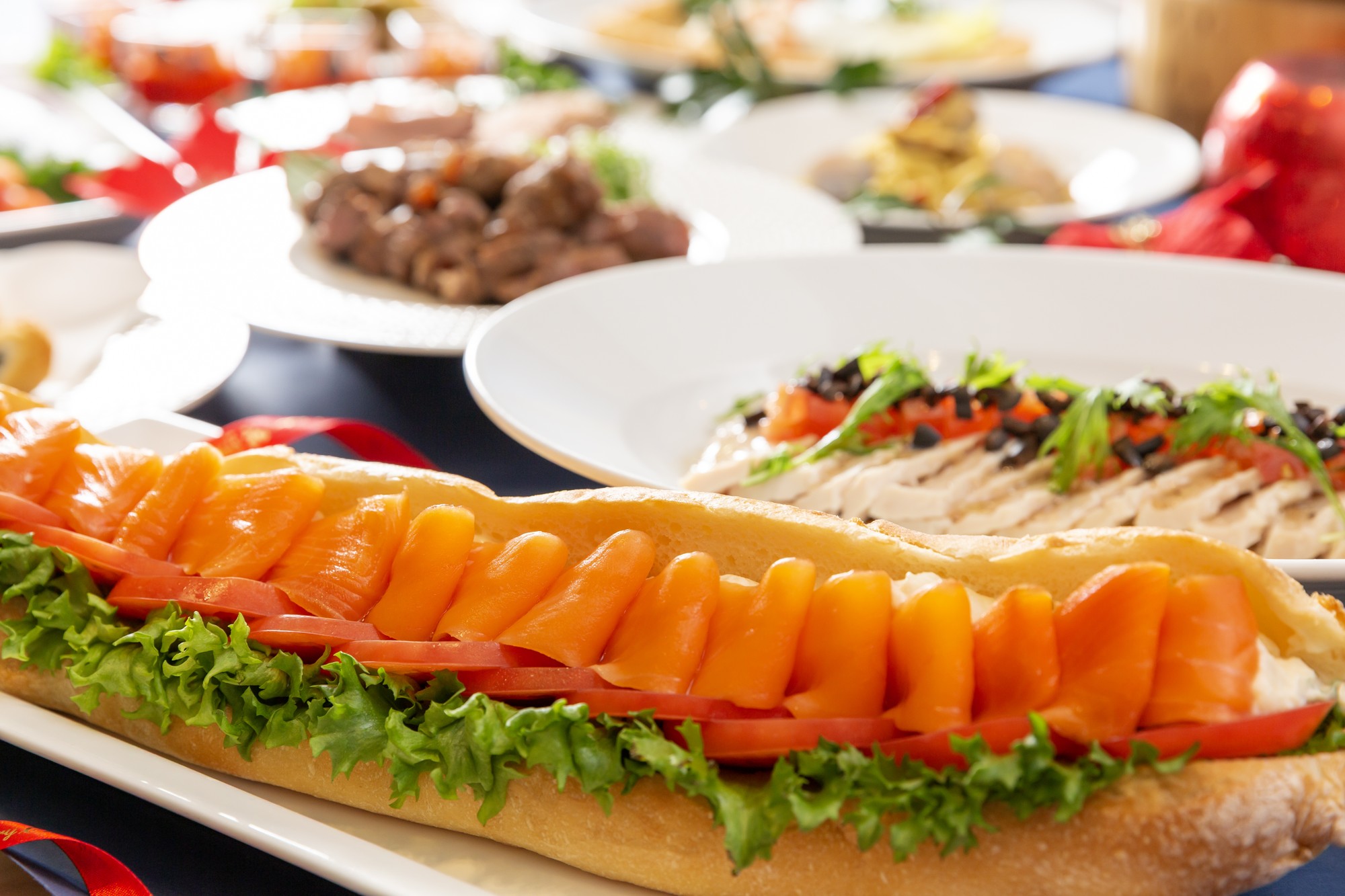 バケット1本にスモークサーモンを贅沢に挟んだ「スモークサーモンのバケットサンド」や、鴨肉とブルーベリーの相性が抜群の「鴨ロース肉のポワレ ブルーベリーソース」など、色鮮やかなメニューが並び、デザートには「ブッシュドノエル」や「苺のマカロン」など、クリスマスならではのラインナップをご提供いたします。
