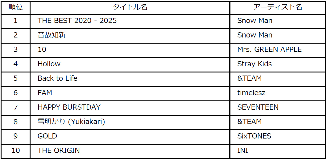 1位タイトル:『THE BEST 2020 - 2025』アーティスト:Snow Man