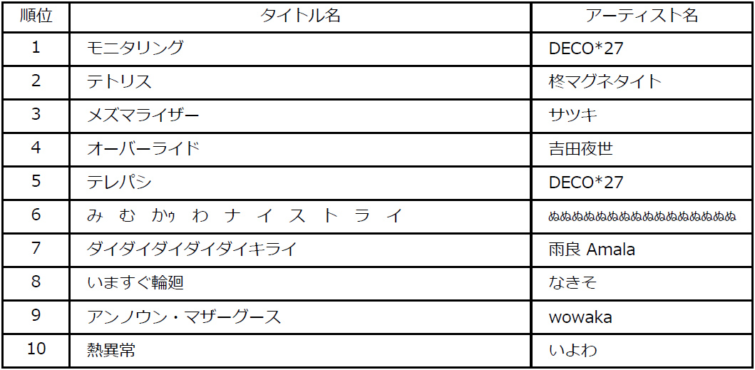 1位楽曲:「モニタリング」アーティスト:DECO*27