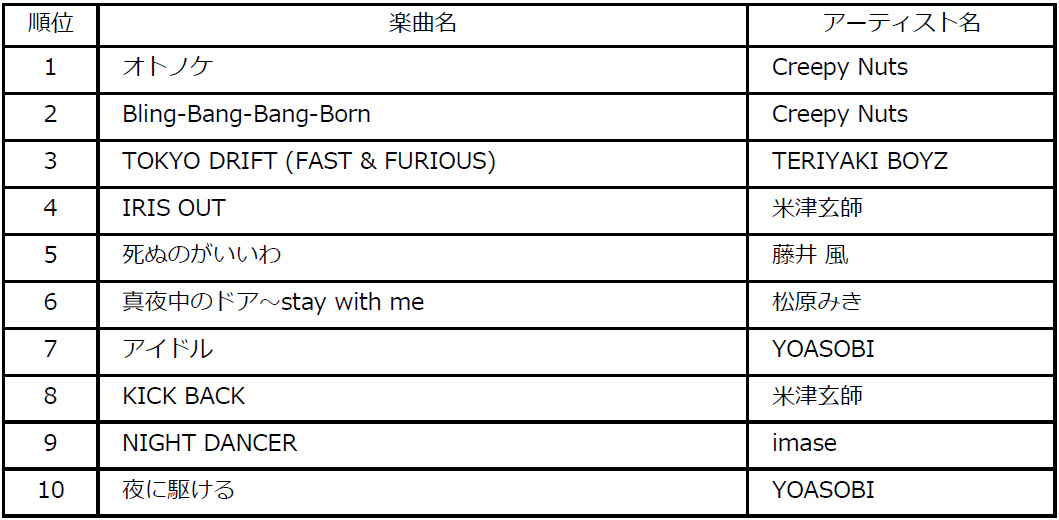 各チャートの順位、アーティスト(Mrs. GREEN APPLE / Snow Man / Creepy Nuts / 大森元貴 / CANDY TUNE / INI / DECO*27 )からの受賞コメントは、次をご覧ください。