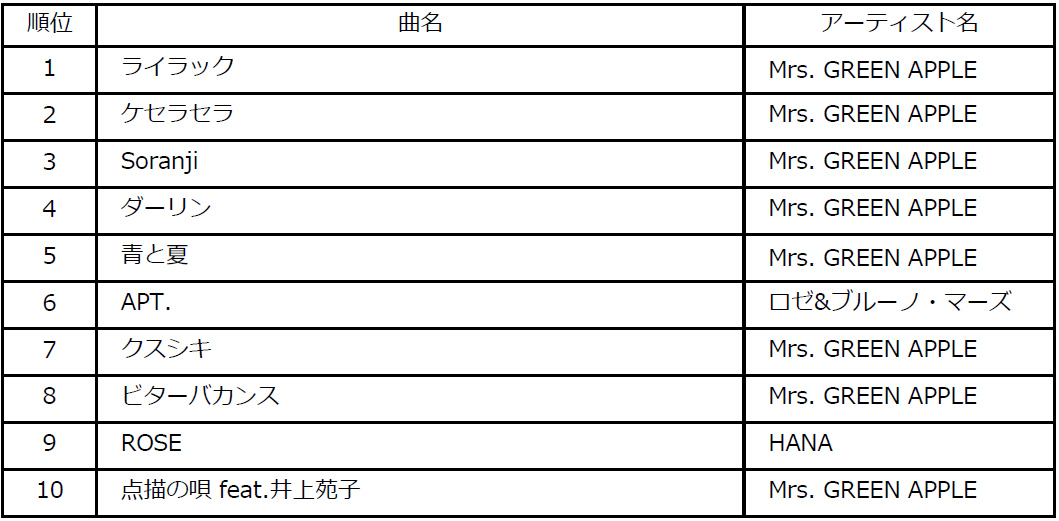 Mrs. GREEN APPLEはトップ5内に3曲、トップ10内に5曲を送り込むという強さを見せました。