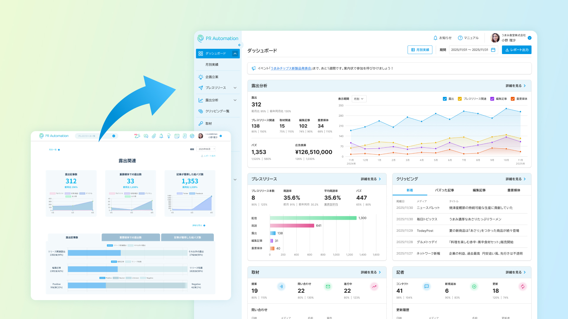 プラップノード株式会社(本社:東京都中央区、代表取締役:渡辺幸光)は、2026年4月1日に統合型広報DX支援ツール「PRオートメーション」をリニューアルいたします。今回のリニューアルでは、デザイン性・操作性の刷新に加え、PR活動と成果の関係をデータとして可視化するユーザー体験を提供し、PRの業務マネジメントをより戦略的に行えるサービスへと進化します。