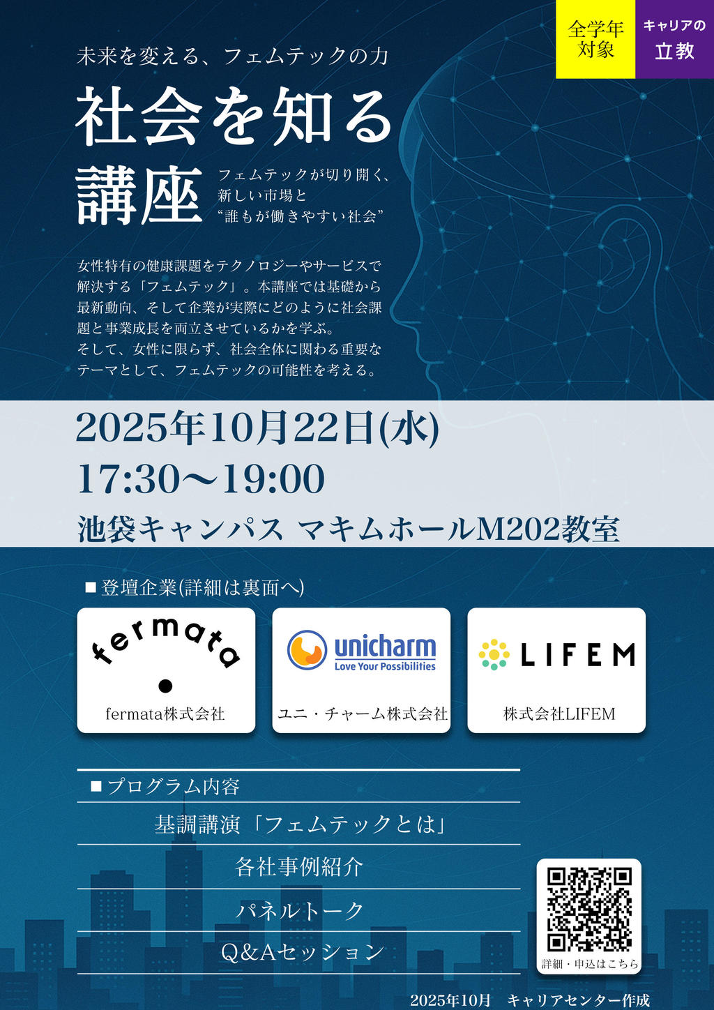 立教大学(東京都豊島区、総長:西原廉太)は、10月22日(水)に『社会を知る講座~フェムテックが切り開く、新しい市場と“誰もが働きやすい社会”~』を池袋キャンパスで開催します。