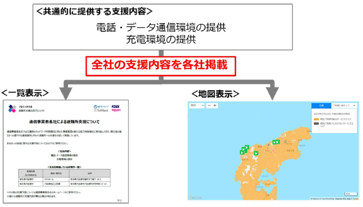 NTTグループ(NTT株式会社、NTT東日本株式会社、NTT西日本株式会社、株式会社NTTドコモ、NTTドコモビジネス株式会社(旧NTTコミュニケーションズ株式会社))、KDDI株式会社、ソフトバンク株式会社および楽天モバイル株式会社の8社は、大規模災害発生時における被災地へのさらなる速やかな支援を目指して、2025年7月に開始した通信事業者間の被災地支援に関する情報連携※1に加え、避難所支援のエリア分担および情報発信の共通化(以下、本体制)を、2025年10月22日に開始します。