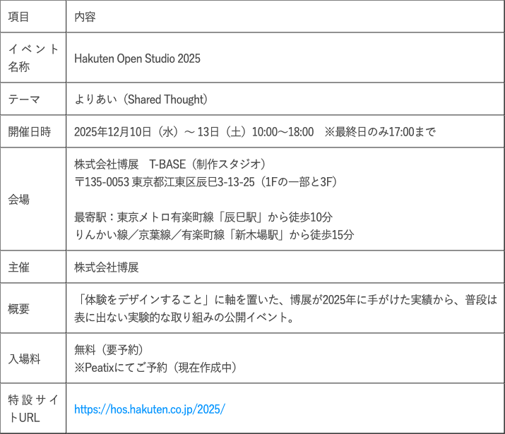 “人と社会のコミュニケーションにココロ通わす体験をつくる”株式会社博展(本社:東京都中央区、代表取締役社長:原田 淳、以下、博展)は、1年間のクリエイティブ活動の集大成を公開するイベント「Hakuten Open Studio 2025」を2025年12月10日(水)〜13日(土)の4日間にわたり、博展の共創拠点T-BASE(東京都江東区)にて開催することを決定いたしました。