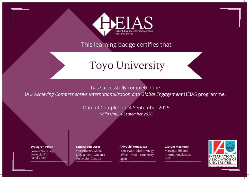 東洋大学(東京都文京区/学長・矢口悦子)は、国際大学協会(IAU:International Association of Universities)が実施する高等教育国際化アドバイザリーサービス(HEIAS:Higher Education Internationalization Advisory Service)において、『包括的国際化およびグローバル・エンゲージメント』のラーニングバッジを、2025年10月7日に受領しました。これは、本学の教育・研究・運営体制の国際化が継続的に発展していると認められたことを示すものであり、日本国内の大学において初めての事例です。