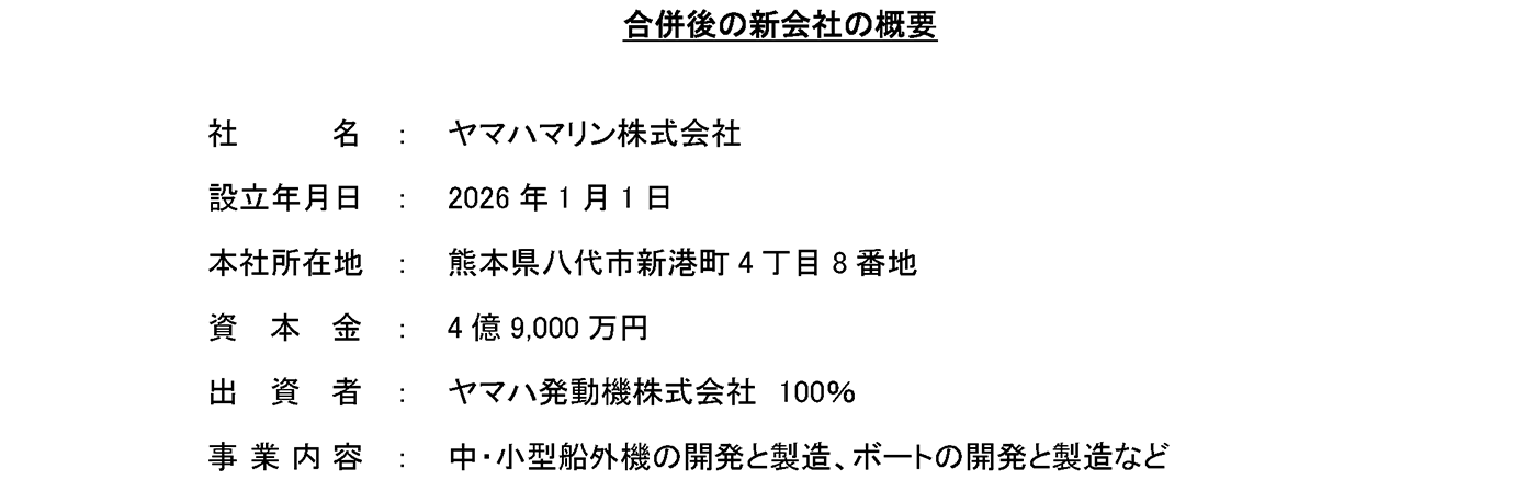 ヤマハ発動機株式会社は、このたび、当社連結子会社で、中・小型船外機の製造を行うヤマハ熊本プロダクツ株式会社(熊本県八代市)と、主にFRP製の中・小型ボートなどの製造を行うヤマハ天草製造株式会社(熊本県上天草市)について、両社の合併を決定しました。また、当合併に伴い、新たにヤマハマリン株式会社(熊本県八代市、以下「ヤマハマリン」)を設立します。