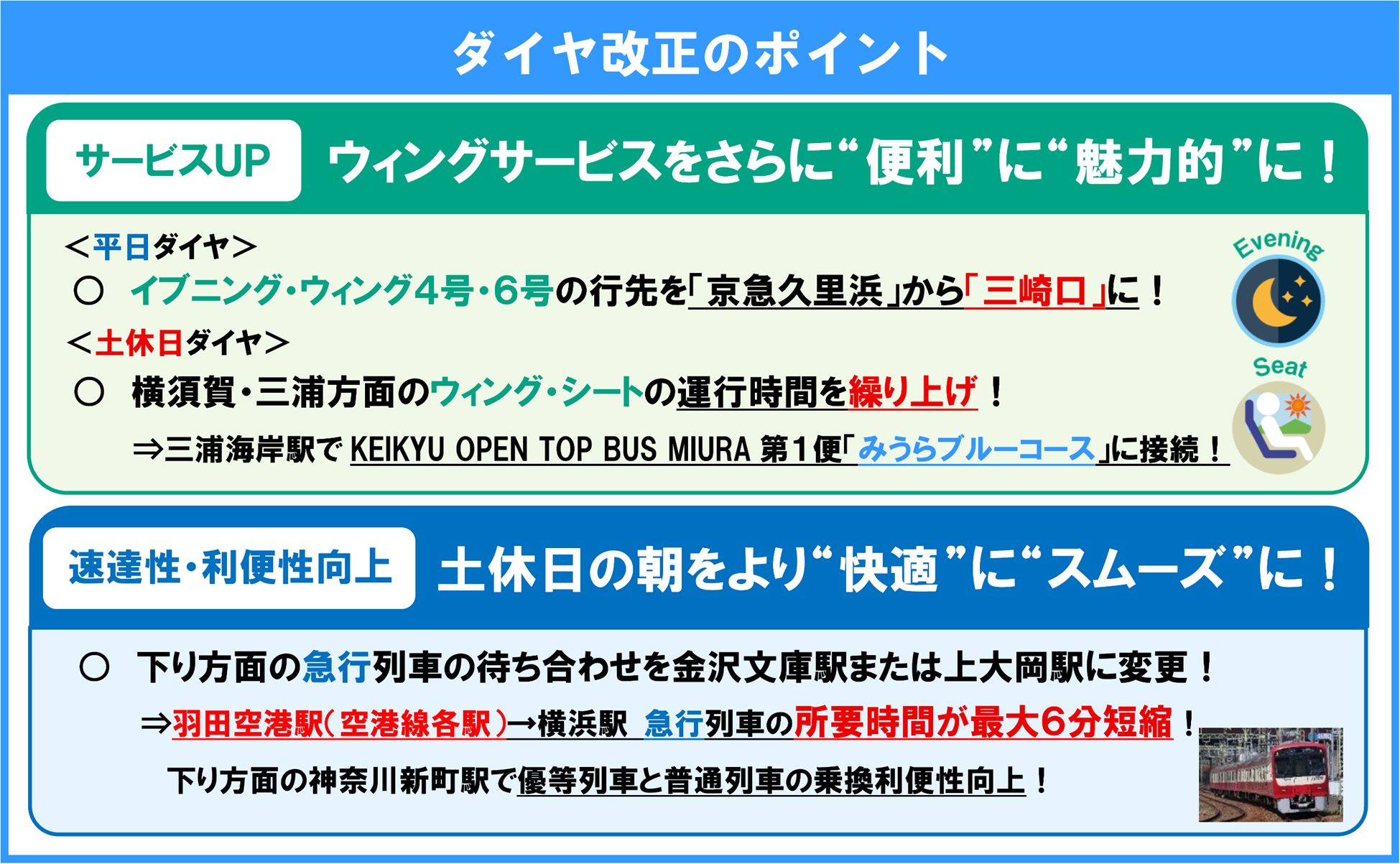 2025年12月13日(土)土休日ダイヤ・12月15日(月)平日ダイヤ 京浜急行電鉄株式会社(本社:横浜市西区,取締役社長:川俣 幸宏,以下 京急電鉄)は,2025年12月13日(土)に土休日ダイヤ,2025年12月15日(月)に平日ダイヤを改正いたします。今回のダイヤ改正の主なポイントは以下のとおりです。 [画像1]https://digitalpr.jp/simg/2357/122370/500_309_202511120923536913d3996368f.png