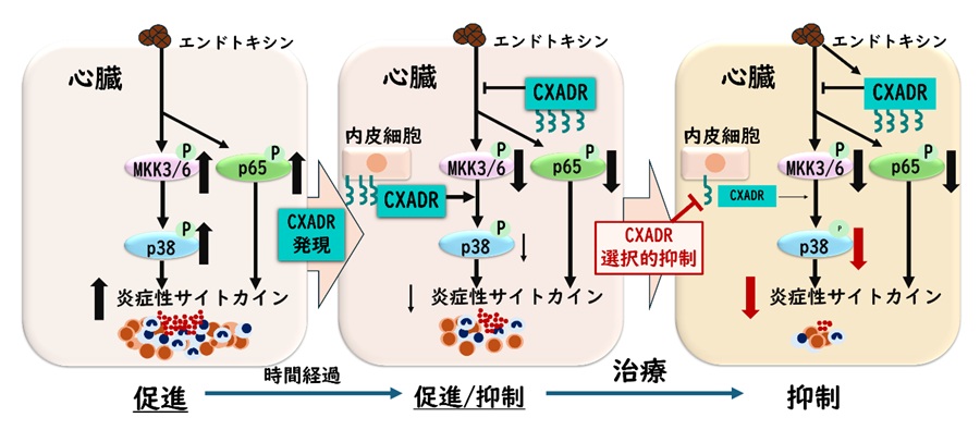 横浜市立大学医学部救急医学 西井基継講師、松村怜生助教らの研究グループは、敗血症の病態解明と根本的治療法の開発を目的に本研究を行い、コクサッキーアデノウイルス受容体(CXADR)*1が敗血症の原因物資であるエンドトキシンによる心不全(心機能障害およびショック)を制御し、さらにその機序としてCXADRが炎症惹起分子であるp38/p65の活性を制御することを明らかとしました。特に、p38の制御様式はCXADRの細胞起源により大きく異なることを発見しました。これらの知見は、心不全を伴う重症敗血症の制御機序解明に寄与し、細胞特異的なCXADR発現操作が有望な治療法となる可能性を明らかとしました。今後、致死率の高い重症敗血症の治療薬開発が前進することが期待されます。