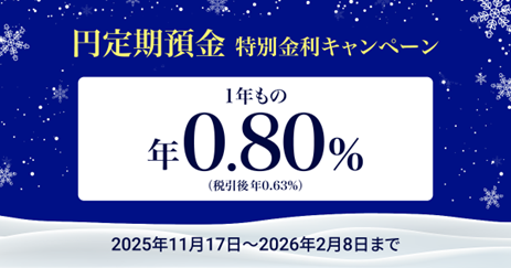 ~「円定期預金1年もの 年0.80%」~ 住信SBIネット銀行株式会社(本社:東京都港区、代表取締役社長(CEO):円山 法昭、以下「住信SBIネット銀行」)は、2025年11月17日(月)より、「円定期預金 特別金利キャンペーン」を開始いたしました。 [画像1]https://digitalpr.jp/simg/2617/122711/700_367_20251117102623691a79bf9f169.png