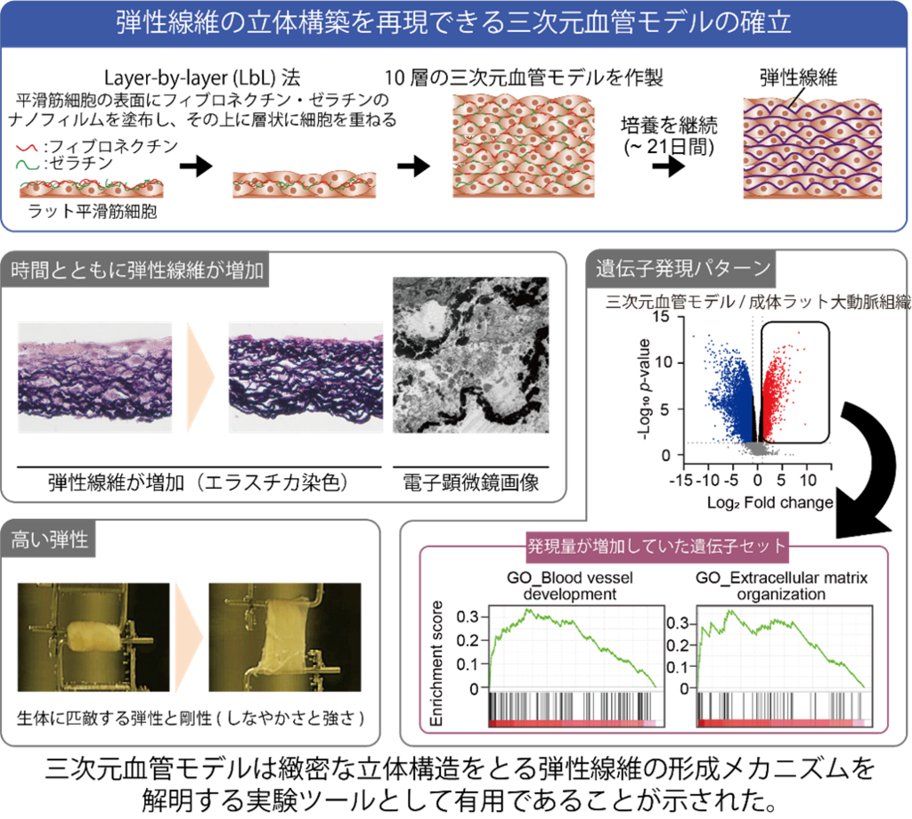 東京医科大学(学長:宮澤啓介/東京都新宿区)、細胞生理学分野 横山詩子主任教授、大学院博士課程 澤田侑理、筑波大学生存ダイナミクス研究センター 柳沢裕美教授、大阪大学大学院工学研究科 松﨑典弥教授、上智大学理工学部 臼杵豊展教授らの研究グループは、血管のしなやかさを生み出す「弾性線維」を立体的に再現できる三次元血管モデルの作製方法を確立しました。