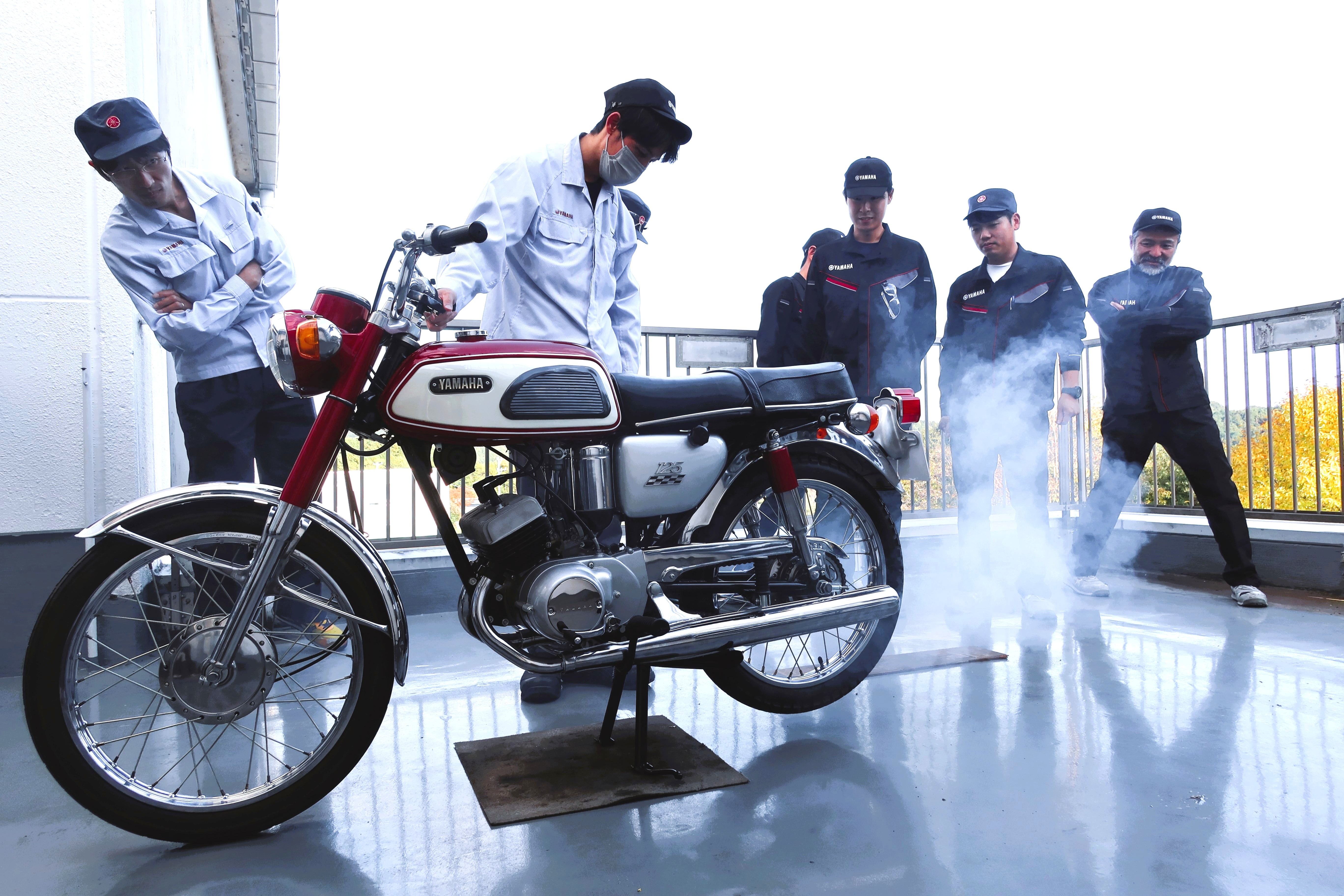 ~歴史製品の復元施設を社員向けに開放。技術者やデザイナー、製品開発の着想に~ [画像1]https://digitalpr.jp/simg/1620/123082/700_466_20251120140428691ea15cac7bd.JPG 豊岡レストアルームの屋外テラス。この日はサウンド開発チームのリクエストを受け、往年の名車たちのエンジンを始動