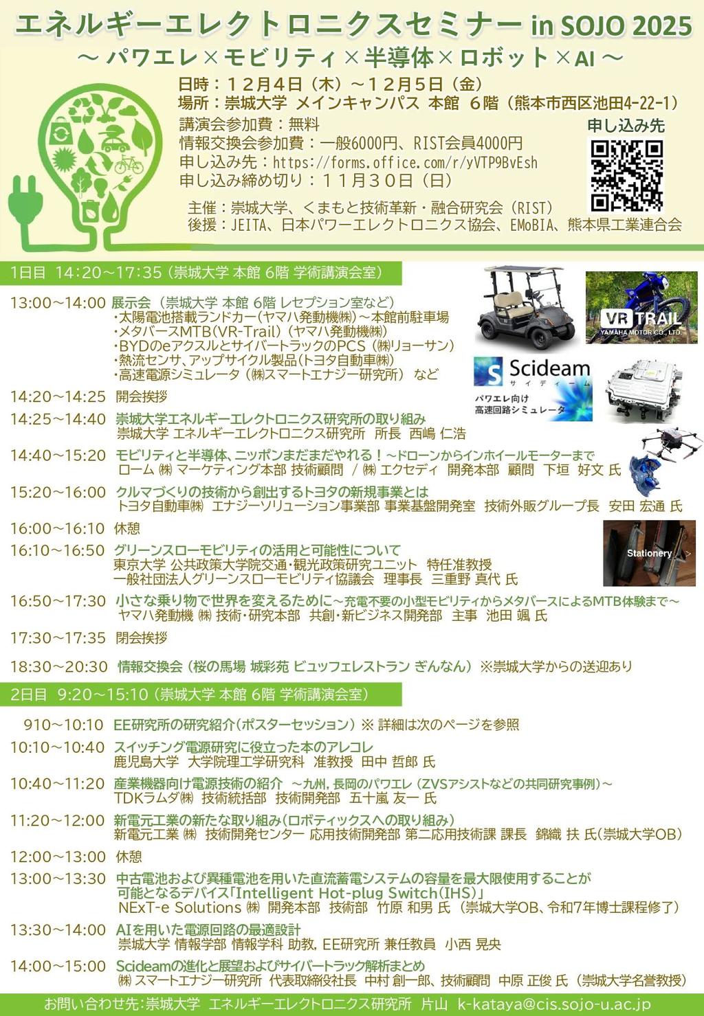 崇城大学では、2025年12月4日(木)・5日(金)の2日間にわたり、「エネルギーエレクトロニクスセミナー in SOJO 2025」を開催します。 本セミナーは、「モビリティ」「半導体」「パワーエレクトロニクス」「ロボット」「AI」などの最先端分野の融合をテーマに、大学・企業・行政の専門家が一堂に会する技術交流イベントです。 エネルギーエレクトロニクス研究所の設立30周年に新体制で再始動をする記念となる本年は、初日に以下の特別講演を実施します。