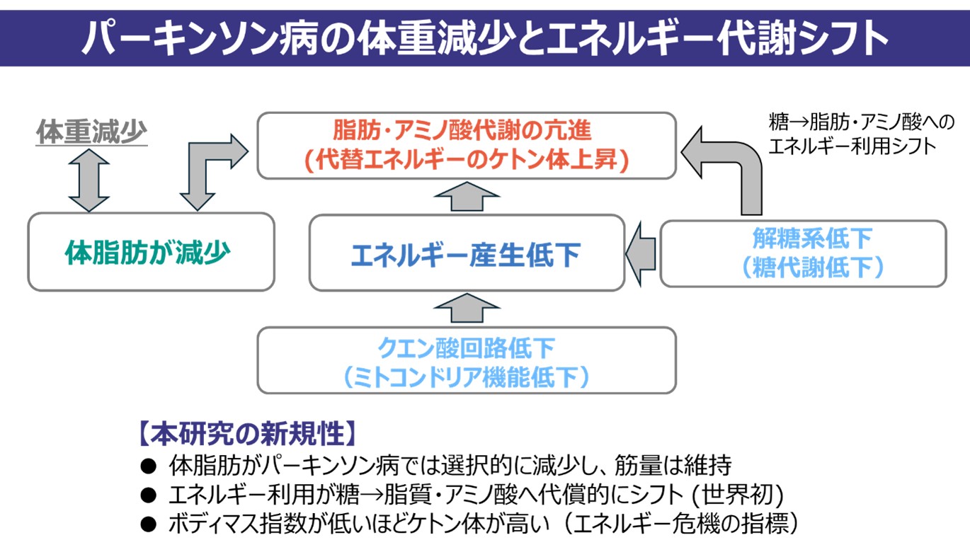 藤田医科大学 脳神経内科学 水谷泰彰准教授、東篤宏助教(現神戸大学)、渡辺宏久教授、内分泌・代謝・糖尿病内科学の鈴木敦詞教授、清野祐介准教授、医用データ科学の吉本潤一郎教授、オープンファシリティセンターの前田康博准教授らの研究グループは、パーキンソン病における体重減少の原因を解明するため、エネルギー代謝異常に着目し、体組成と血中代謝物のデータを多面的に解析しました。この結果、パーキンソン病患者では体重減少の原因として体脂肪の減少が関与することを明らかにしました。また、糖代謝の低下と脂質代謝の亢進、すなわちエネルギー代謝のシフトを認めることが明らかになりました。この発見は、パーキンソン病におけるエネルギー代謝の理解を深め、今後の栄養介入や代謝に着目した治療戦略の構築に寄与することが期待されます。