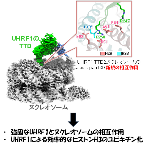 横浜市立大学大学院生命医科学研究科 構造生物学研究室(エピジェネティクス構造生命科学)有田恭平教授、敷町怜愛さん(2023年度修士課程修了)らの研究グループは、DNAメチル化*1維持に必須なE3ユビキチンリガーゼUHRF1*2が、ヌクレオソーム(DNAとヒストンの複合体)に結合し、ヌクレオソーム中のヒストンH3*3をユビキチン化*4する構造的しくみをクライオ電子顕微鏡*5(cryo-EM)により解明しました。本成果は、DNAメチル化の安定維持機構を分子レベルで理解するうえで重要な知見であり、がんをはじめとするエピジェネティック異常疾患の治療標的探索にも貢献することが期待されます。