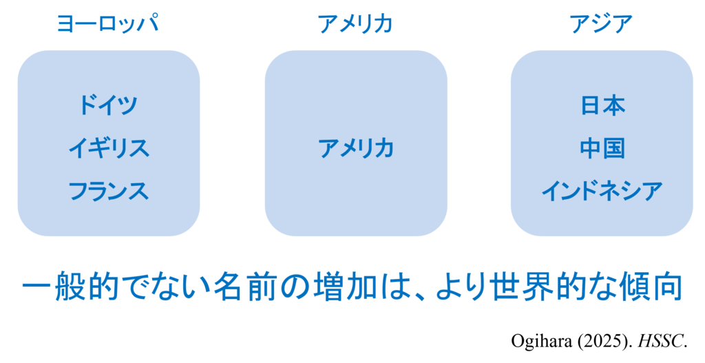 【ポイント】 ・これまで国ごとに個別に報告されていた、一般的でない名前の経時的変化を実証的に検討した研究を概観した。 ・一般的でない名前の増加は、これまで検討されたすべての国、ドイツ・アメリカ・イギリス・フランス・日本・中国・インドネシアで共通して見られた。この変化は、ヨーロッパ・アメリカ・アジアという多様な文化圏で共通して見られており、より世界的な傾向と言える。
