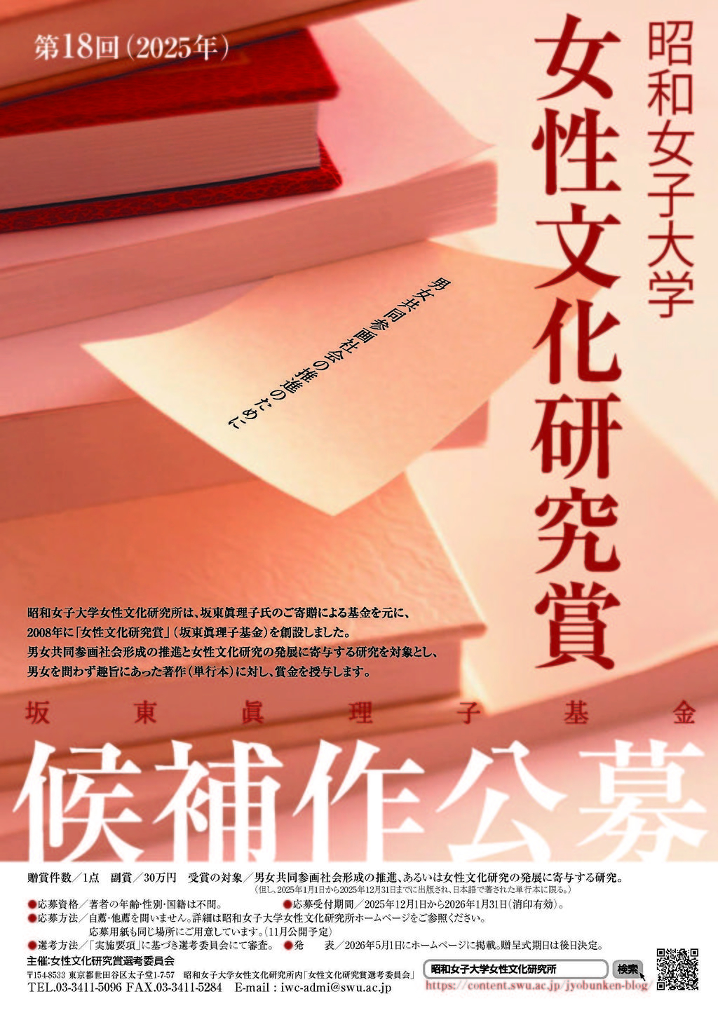 昭和⼥⼦⼤学 (学⻑ ⾦尾朗︓東京都世⽥⾕区) は、男⼥共同参画社会の推進・⼥性⽂化研究の発展に寄与する2025年中に出版された書籍を顕彰するため、「第18回昭和⼥⼦⼤学⼥性⽂化研究賞 (坂東眞理⼦基⾦)」の候補作の応募を2026年1⽉31⽇まで受け付けています。