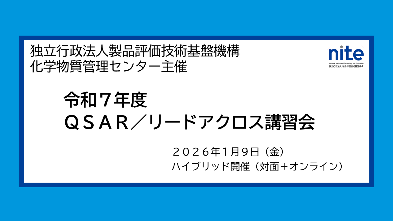 独立行政法人製品評価技術基盤機構【NITE(ナイト)、理事長:長谷川 史彦、本所:東京都渋谷区西原】は、2026年1月9日(金)に「令和7年度QSAR/リードアクロス講習会」をハイブリッド(無料)で開催いたします。
