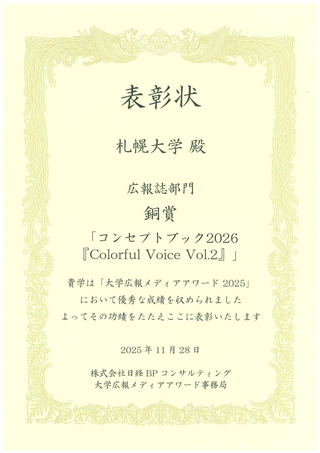 札幌大学(札幌市豊平区/学長:大森義行)が高校生向けに制作した『コンセプトブック2026 Colorful Voice Vol.2』(2025年7月発行)が、「大学広報メディアアワード2025」(主催:日経BPコンサルティング)広報誌部門において銅賞を受賞した。同アワードは、全国の大学が発行・発信する広報メディア(広報誌、デジタルコンテンツ、動画など)を対象に、その品質や創意工夫を評価し、より良い広報コミュニケーションのあり方を提起することを目的としたもの。今年度は全国84大学、189作品がエントリーし、審査結果は11月28日開催の表彰式において発表された。