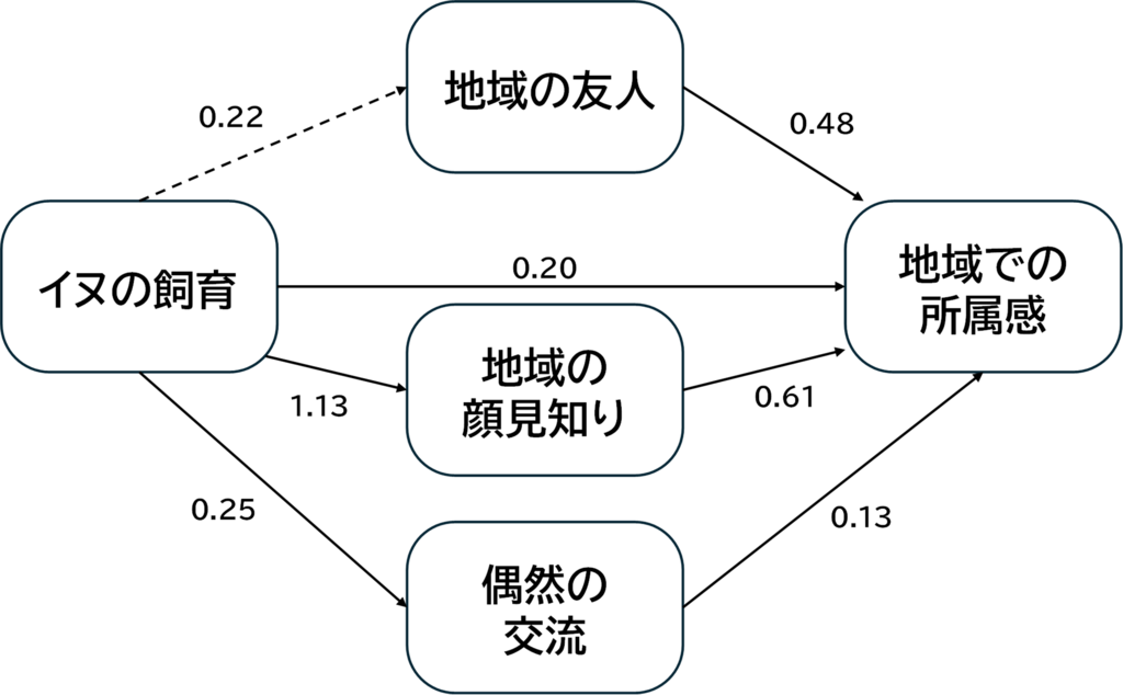 この研究では犬の飼い主は定期的な散歩で居住地の近隣を散歩すること、そして犬を連れていることで通りすがりの人々ともちょっとした会話をする機会を得ているという海外での先行研究を元に、日本でも飼い主は、地域の人々と顔を合わせる機会が多くなり、顔見知りを増やしているという予測の元に行われました。結果として、犬の飼い主は近隣に住む友人の数では飼い主ではない人と変わらない一方で、生活の中で繰り返し顔を合わせる相手がいる場合が多いこと、通りすがりの誰かとの偶然の会話が多いことが明らかになりました。そして、繰り返し顔を合わせる顔見知りの存在が、町の一員であるという感覚、すなわち地域に対する所属感を高めることも明らかになりました。この効果は、猫の飼育、犬猫ではないペットの飼育では確認されませんでした。