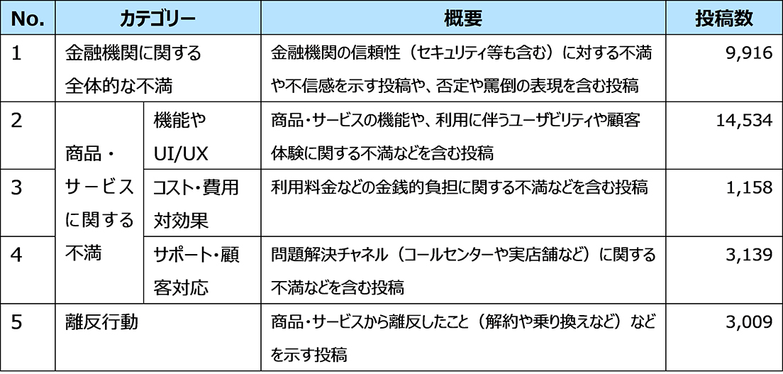 このたび、株式会社NTTデータ経営研究所(所在地:東京都千代田区、代表取締役社長:山口 重樹、 以下 当社)は、SNS上の投稿の中で表現される金融機関に対する「不満」に注目し、X上で発信された顧客の声の分析とその結果(以下、本調査)をまとめましたので、お知らせします。