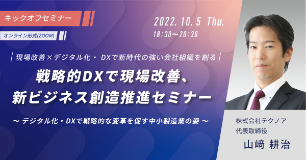 株式会社テクノア 代表取締役 山﨑 耕治が、2022年10月5日に開催される、尼崎商工会議所が主催する中小製造業様向けセミナー現場改善×デジタル化・ DXで新時代の強い会社組織を創る戦略的DXで現場改善、新ビジネ...