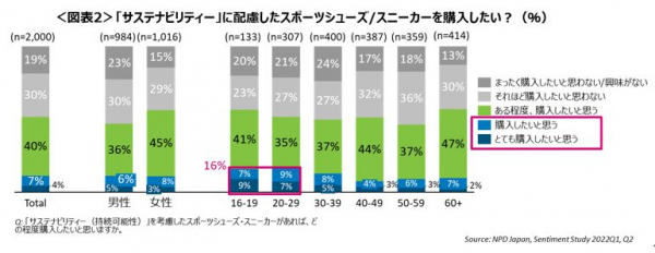 2022年7月に実施した、日本全国16-69歳の消費者2000人を対象とした自主調査「センチメント・スタディ」によると、「サステナビリティー」に配慮したスポーツシューズ/スニーカーを「購入したい」と回答したのは、消費者の11%でした(図表1)。最も多かったのは「ある程度は購入したいと思う」という消極的支持層で、全体の40%でした。
