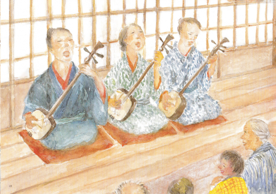 一年に一度、厳しい労働である田植えを終えた後、村を訪れる瞽女は、人々にとって喜びや娯楽を与えてくれる存在でした。そして、それは雪深い上越で、身体にハンディキャップを抱える女性たちが社会の中で共生する救済システムでもありました。