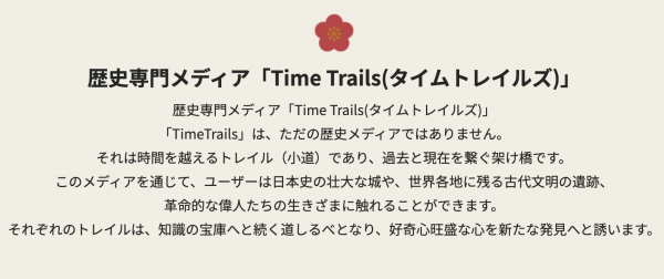 タイムトレイルズでは、歴史をこれから好きになる人から歴史愛好家の方々まで楽しんで頂けるようクイズ機能や診断機能、その他歴史の深部まで迫れるようなコンテンツなどの配信を予定しております。