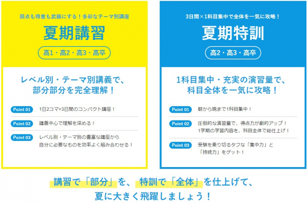 「夏を制するものは受験を制する」と言われるように、暑い夏をどう過ごすかが毎年受験生の合否を決めています。四谷学院では「3日連続」「テーマ学習」が特徴。各科目単科講座形式で、レベル別・テーマ別にバリエーション豊富な講座が用意されています。