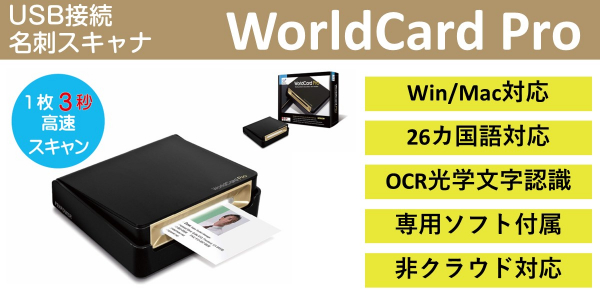 「WorldCard Pro」は、名刺を素早く読み取ってデータ化してパソコンで管理できるUSB名刺スキャナです。名刺1枚を約3秒で読み取ってデータ化できます。連続スキャンにも対応し、大量にある名刺でも入力作業の短縮化、検索してぐす見つかり、管理しやすい名刺管理ツールです。氏名/会社名/電話番号/Eメール/住所/ウェブサイト/名刺画像などの情報をデータで保存できます。日本語の認識率は約90~95%と高く、26カ国語(日本語、英語、中国語など)の名刺を読み取り、最大登録数は約3000枚、表示言語12ヶ国語対応します。専用ソフトはWindows・Mac OS対応。Excel/テキスト/CSV/JPEGなどのファイルに書き出して、別のソフトでデータを活用できます。