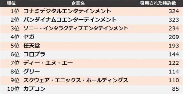 ゲーム・エンターテインメント業界の被引用件数上位30社のランキング