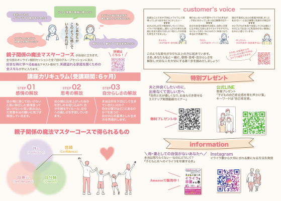 受講者特典:(1) 著書の 「電子書籍『子どもと夫へのイライラを卒業する本』」をプレゼント