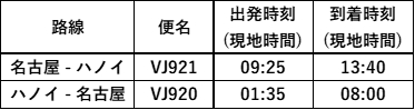 *ベトジェット 名古屋 - ハノイ線の運航スケジュール (毎日運航)