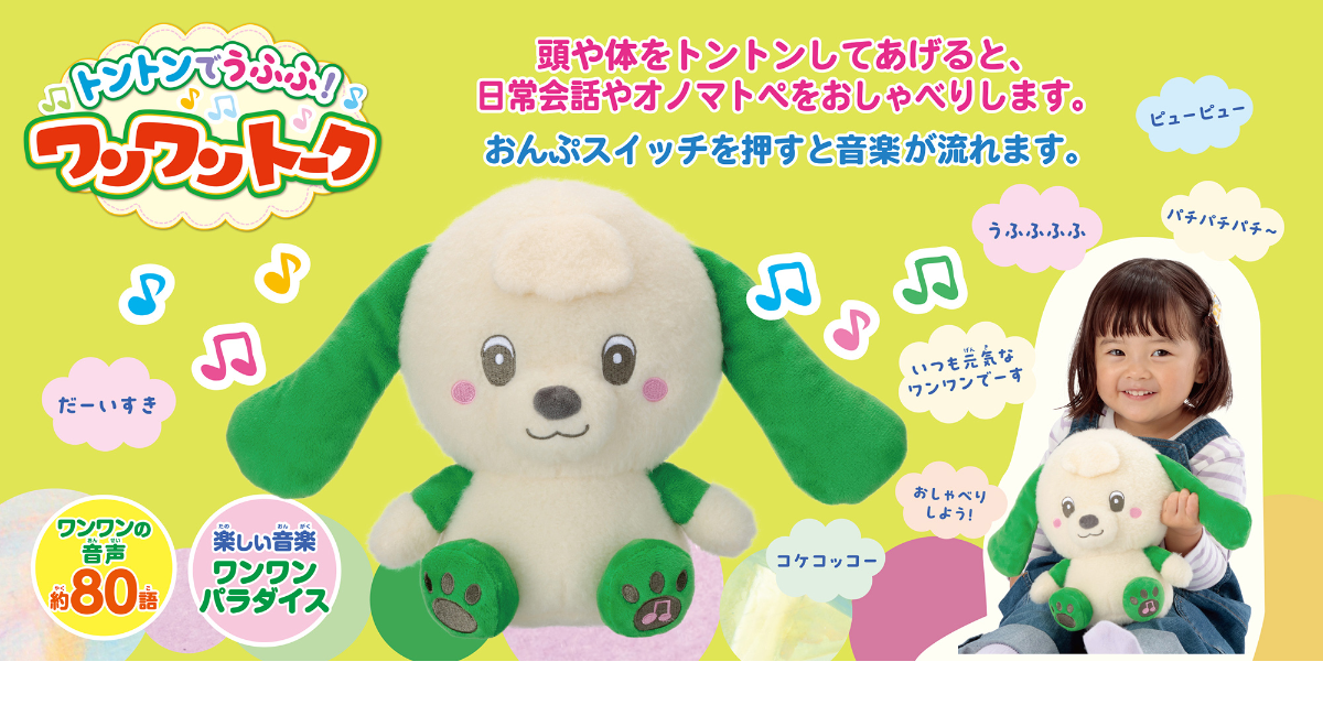 たくさんおしゃべりする「ワンワン」と、ワンワントーキング!老舗玩具メーカーが、言葉や音楽の流れるぬいぐるみ「トントンでうふふ!ワンワントーク」を9月中旬に発売