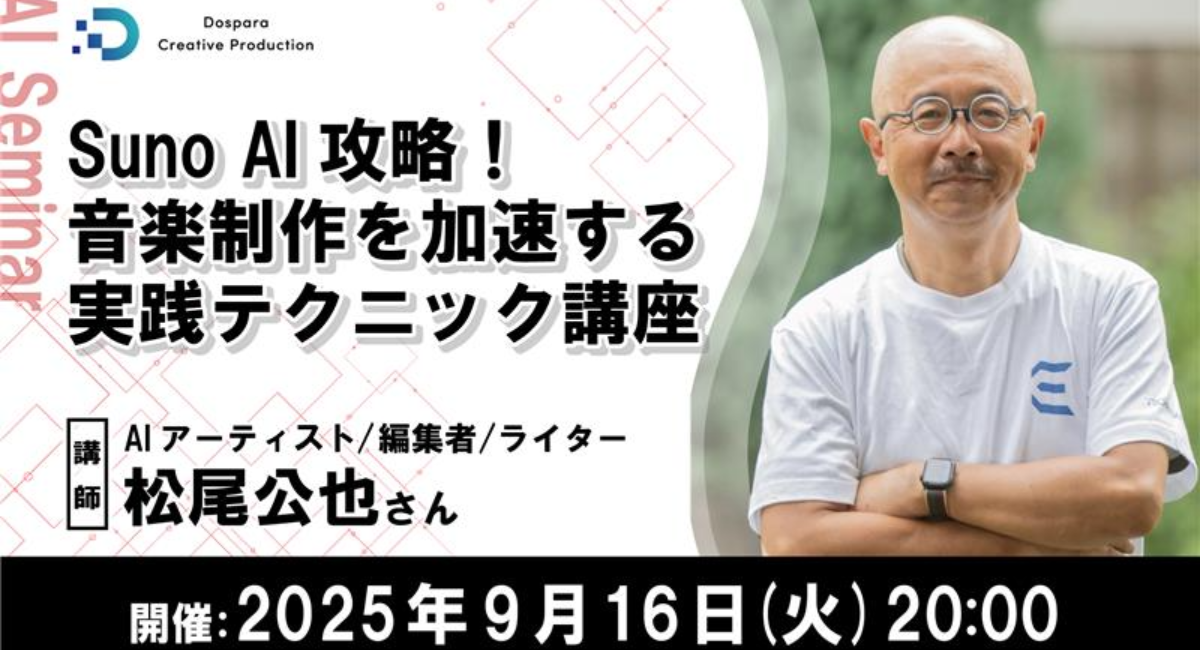パソコン専門店ドスパラは、AIアーティストで編集者・ライターの松尾公也氏を迎え、「Suno AI攻略!音楽制作を加速する実践テクニック講座」を、2025年9月16日(火) 20時よりオンラインで開催します。現在、参加者を募集しています。