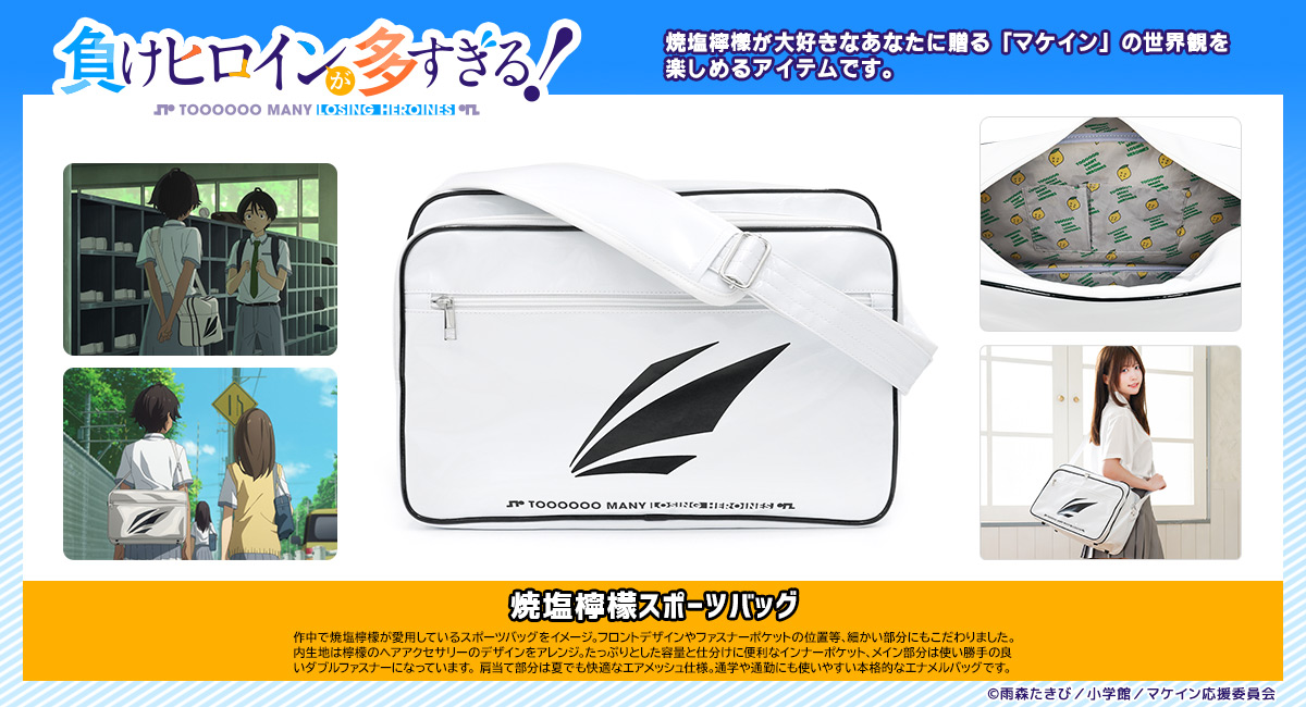 有限会社アクロス(本社:大阪市中央区、 代表取締役:中 礼)は、TVアニメ「負けヒロインが多すぎる!」より、作品の世界観を楽しめる再現シリーズを発売します。第二弾は作中で焼塩檸檬が愛用しているスポーツバッグをイメージ。デザインや仕様にもこだわりました。焼塩檸檬が大好きなあなたに贈る「マケイン」の世界観を楽しめるアイテムです。【再現シリーズ第一弾】毎日のランチタイムが楽しくなる八奈見杏菜のトートバッグとおにぎりポーチ!作中に登場する八奈見杏菜がお弁当を入れているトートバッグをイメージした、コットン素材の使い勝手良い「トートバッグ」と、食いしん坊な八奈見杏菜をリスペクトした「おにぎりポーチ」。