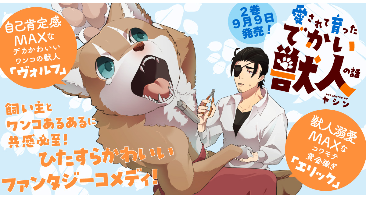 【新刊発売!】自己肯定感MAXな獣人「ヴォルフ」強面賞金稼ぎ「エリック」のファンタジー日常漫画『愛されて育ったでかい獣人の話』。待望の第2巻が9月9日発売!!