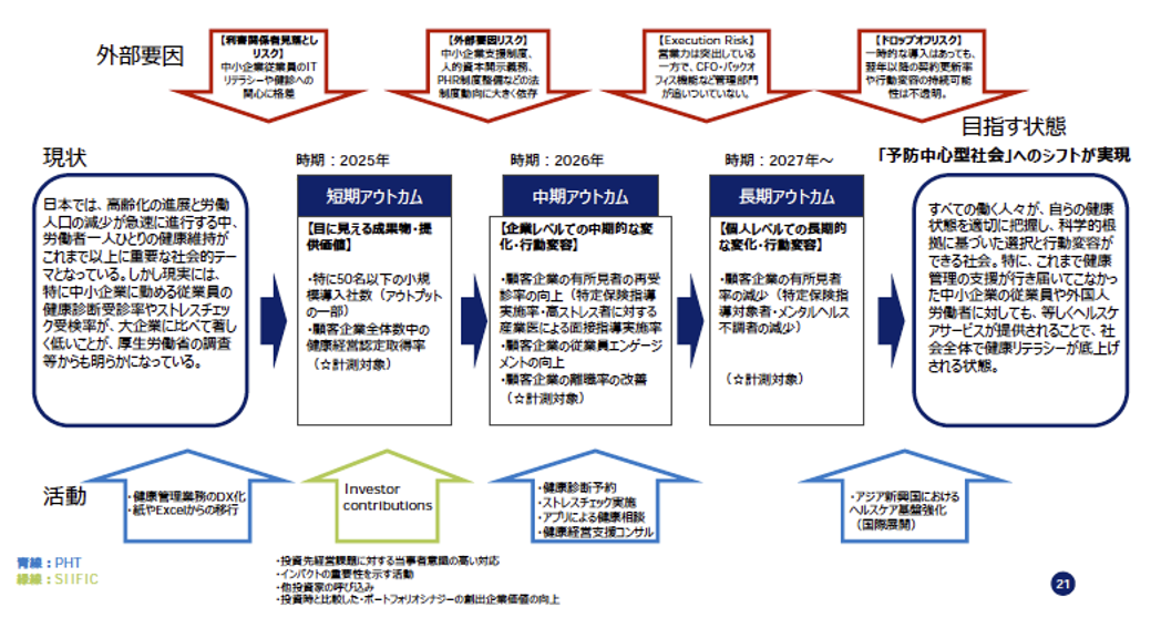 SIIFICウェルネスファンドは、PHTの健診業務・人的資本情報対応などフルスタック型健康管理サービスのコストパフォーマンス、外国語対応、DX支援の点において、明確な市場優位性を有しているものと評価しています。また、PHTは大手企業だけでなく、「10人〜30人程度の事業者」に向けた専用パッケージ(KENSAPO for Business Light)を開発しており、これらが広く普及することで「予防中心型社会」へのシフトが実現でき、国内におけるウェルネス・リテラシーの向上に資するものと期待しています。