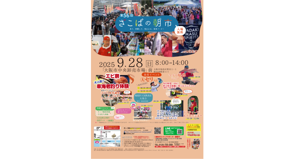 Mapion > ニュース > リリース > 【9月28日(日曜)】プリップリの車エビを食べ尽くそう! 大阪市中央卸売市場前遊歩道にて『ざこばの朝市 秋の海老祭り』開催いたします