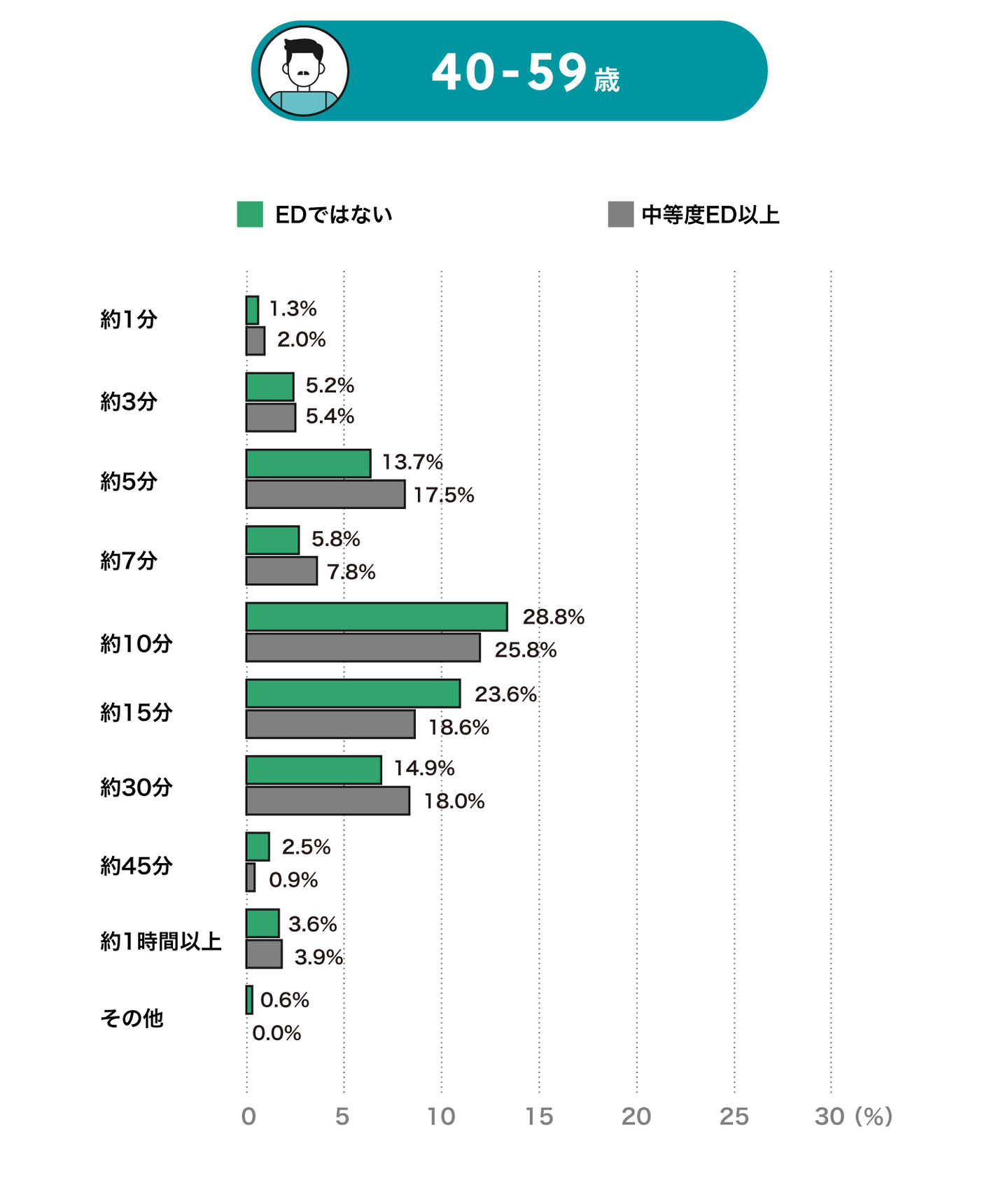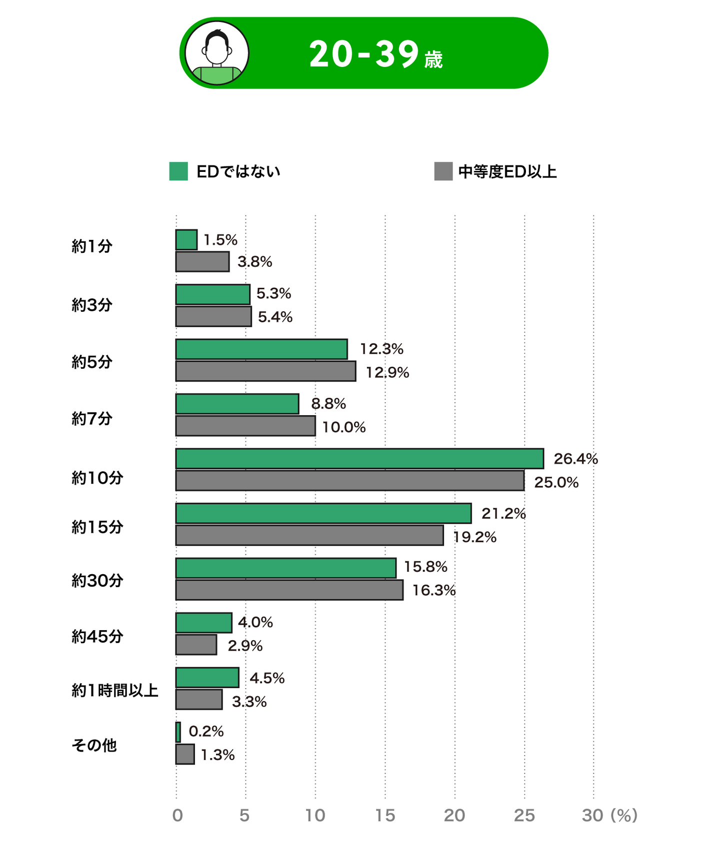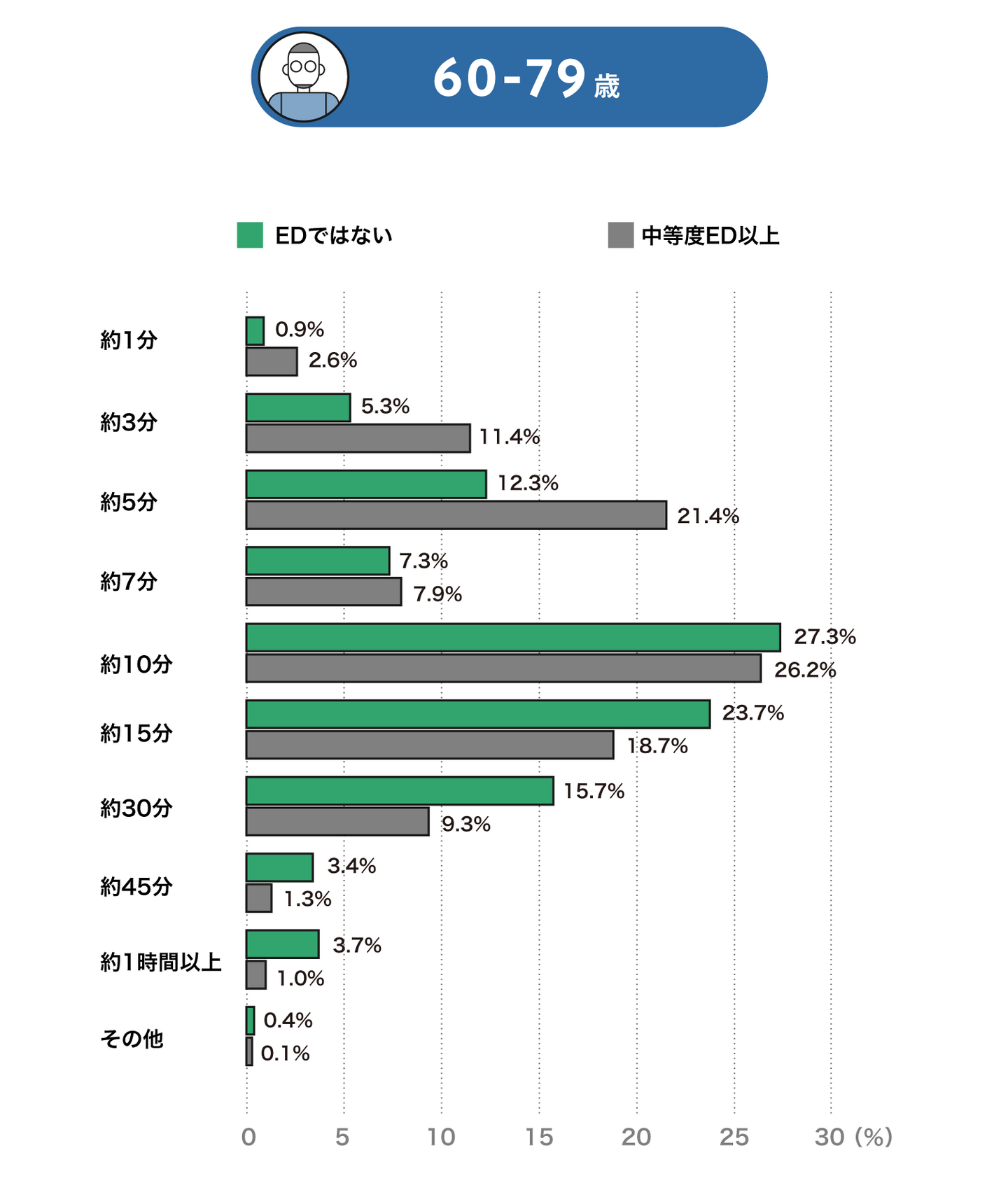 60歳~79歳代では、EDではない方は「10分」が最も多く、次に「15分」「30分」「5分」となります。中等度以上のEDの方も最も多いのは「10分」ですが、次に「5分」「15分」「3分」と短くなります。これは若い世代ではさほど影響はないものの年齢を重ねるにつれて大きく影響する結果となりました。