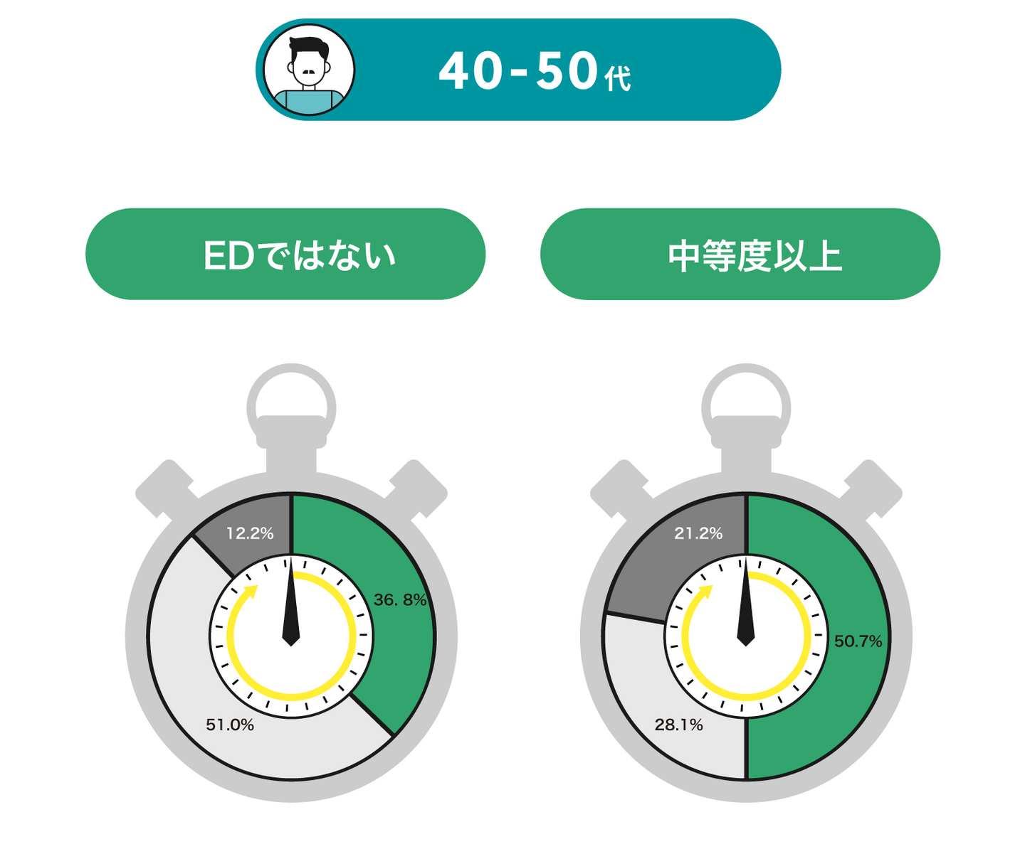 今回の調査で20歳~79歳、全世代でEDが進行すると自身が早漏もしくは遅漏と感じる割合も高くなることがわかりました。