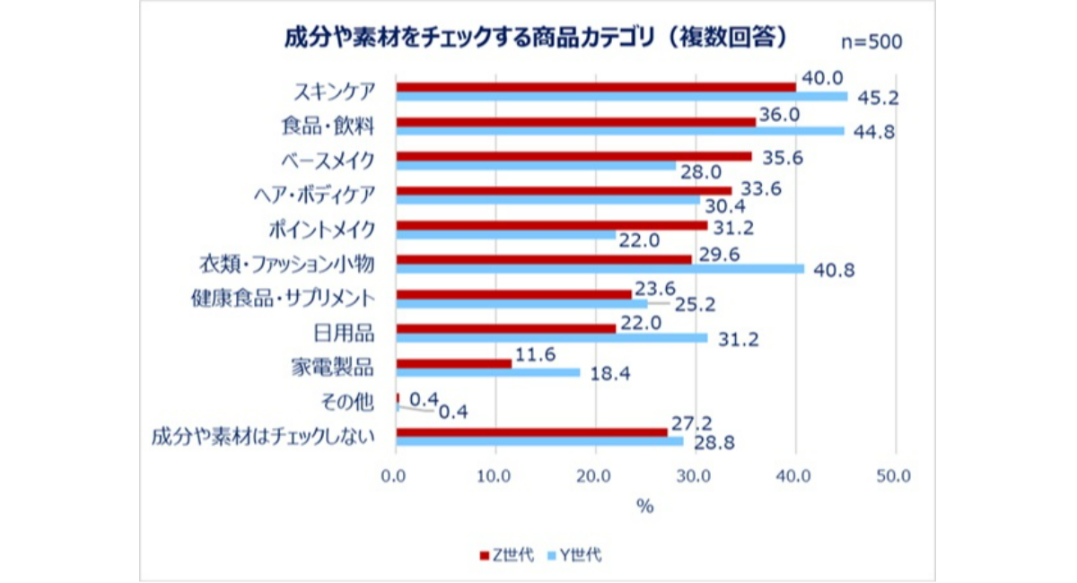 衝動買いではなく、成分や効果を確認して類似商品と比較したり、本当に必要かよく考えたりしてから購入する買い物のスタイルは、近年「ロジカルショッピング」や「ロジカル買い」と呼ばれています。買い物の仕方やトレンドに変化が起きている現在、女性たちを対象に、どのような基準で買い物をしているのか様々な視点で質問しました。その結果、特にスキンケアや食品・飲料について成分や素材をチェックしてから購入する女性が多いことや、成分や素材まで見るようになったきっかけ、参考にしている情報源などから、女性たちの物の買い方が見えてきました。15歳~28歳を「Z世代」、29歳~44歳を「Y世代」と定義し、世代別で回答を比較することで、年齢による傾向の違いも見えてきました。