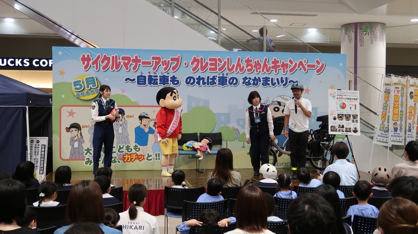 活動内容:イオンモール与野で行われた、埼玉県警主催の交通啓発イベントに協力。クレヨンしんちゃんやコバトンと共に、保育園児とその保護者に対して交通ルールの説明、ヘルメットの正しい着用方法の実演を行いました。